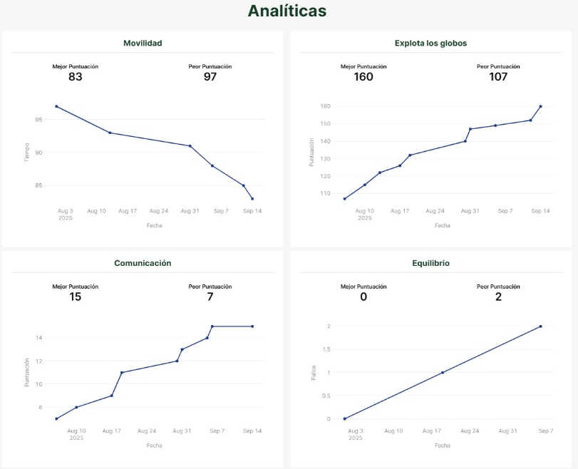 Cada sesión queda registrada: cumplimiento, repeticiones y métricas de ejecución. Revisas la evolución por paciente y decides ajustes con información comparable en el tiempo.